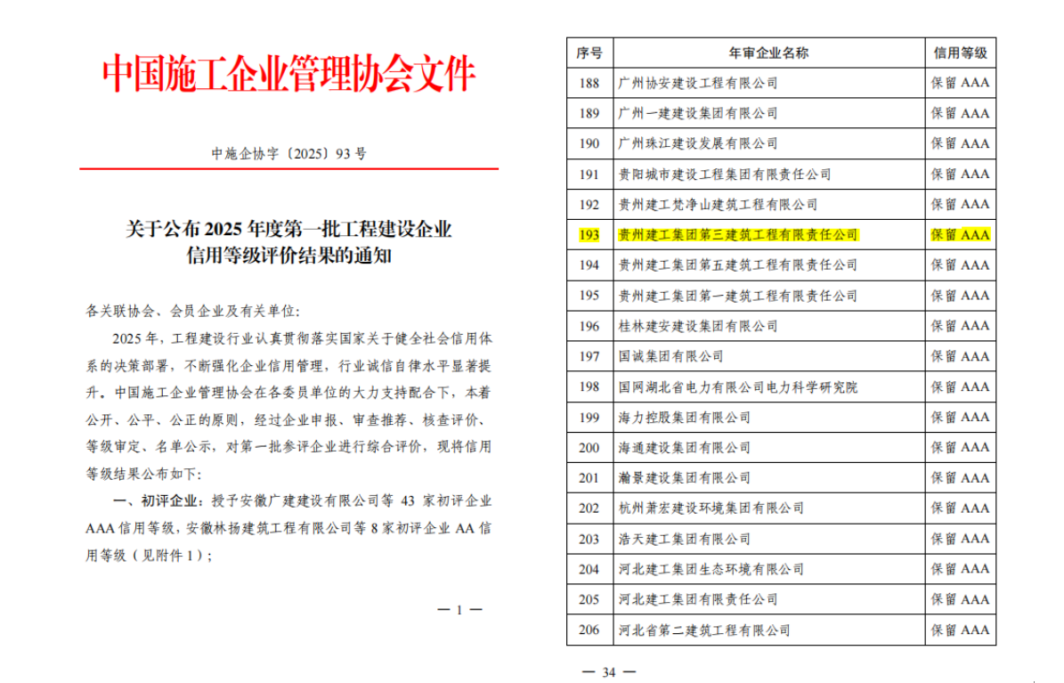日前,中国施工企业管理协会发布《2025年度第一批工程建设企业信用等级评价结果通知》,公司凭借稳健的经营状况与良好的信用积淀,顺利通过信用等级年度审核,持续保持工程建设行业信用评价体系的最高等级——AAA级。这一成果不仅是行业对公司稳健经营、规范管理的高度认可,更是公司践行“诚信为本”发展理念的有力见证。