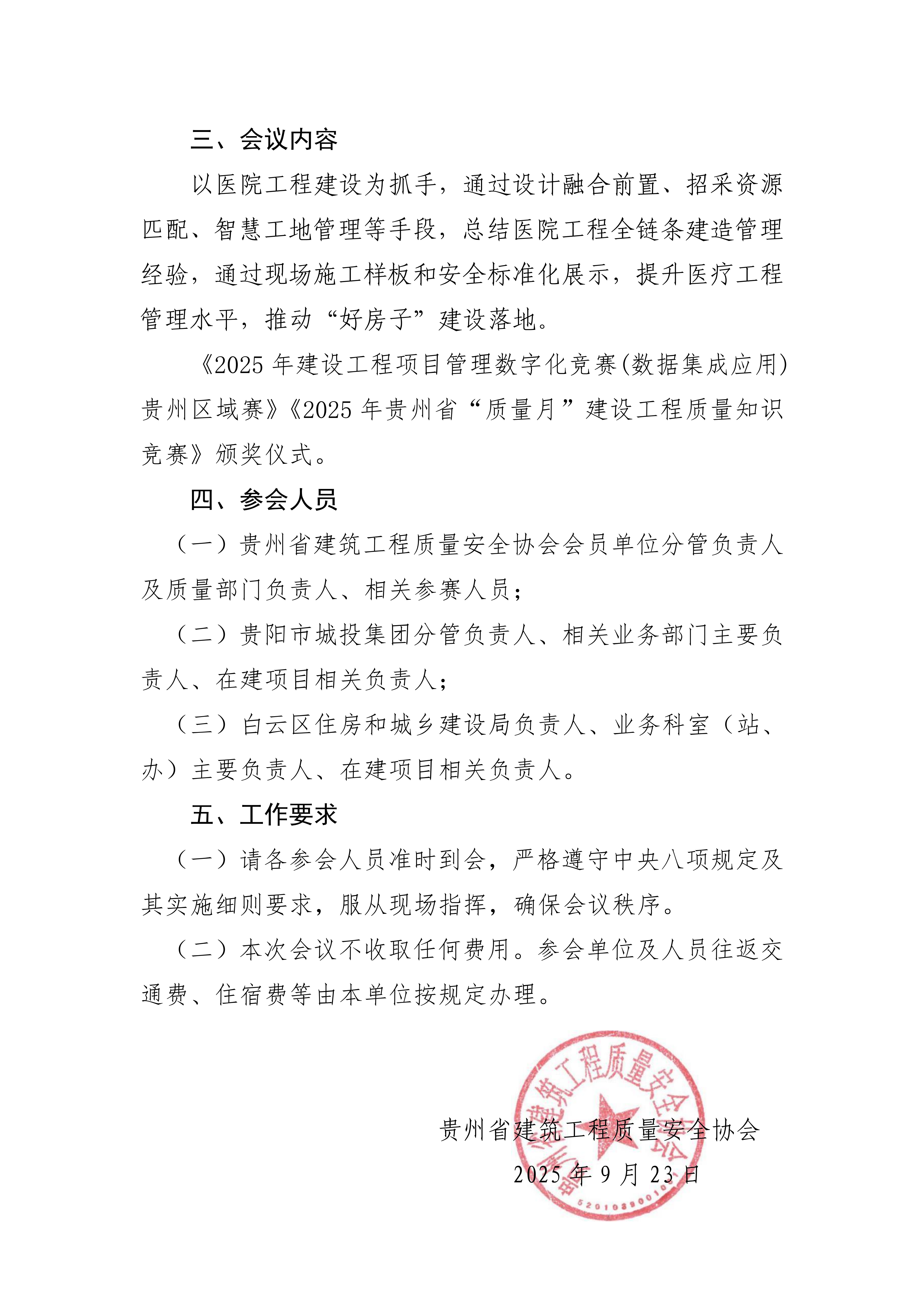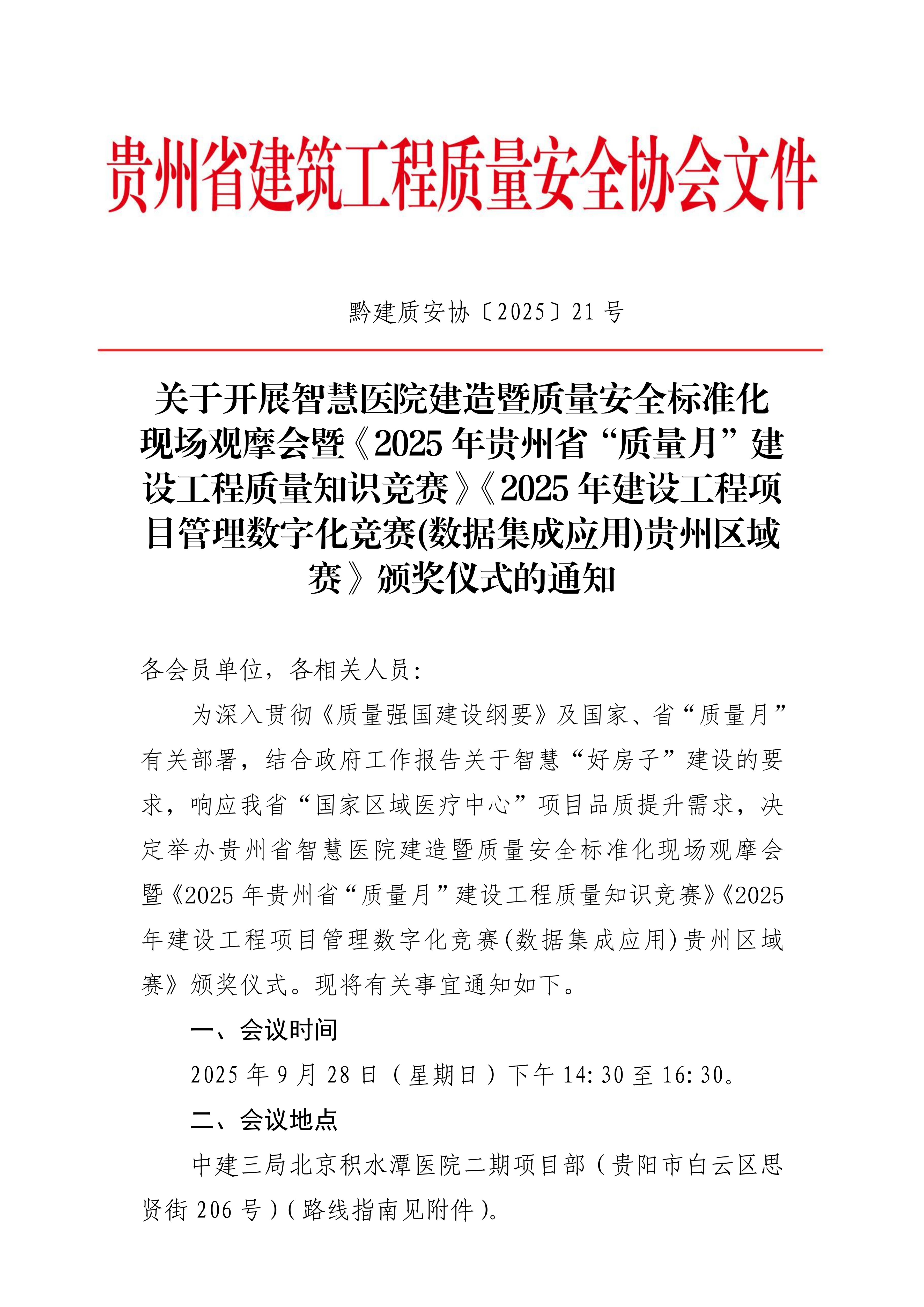 文件下载:关于开展智慧医院建造暨质量安全标准化 现场观摩会暨《2025 年贵州省“质量月”建 设工程质量知识竞赛》《2025 年建设工程项 目管理数字化竞赛(数据集成应用)贵州区域 赛》颁奖仪式的通知.pdf