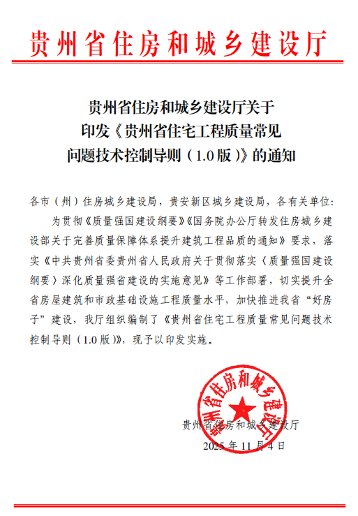 贵州省住房和城乡建设厅关于印发《贵州省住宅工程质量常见问题技术控制导则(1.0 版)》的通知