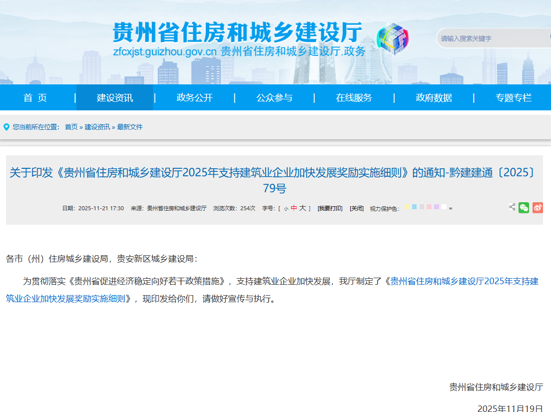 关于印发《贵州省住房和城乡建设厅2025年支持建筑业企业加快发展奖励实施细则》的通知-黔建建通〔2025〕79号