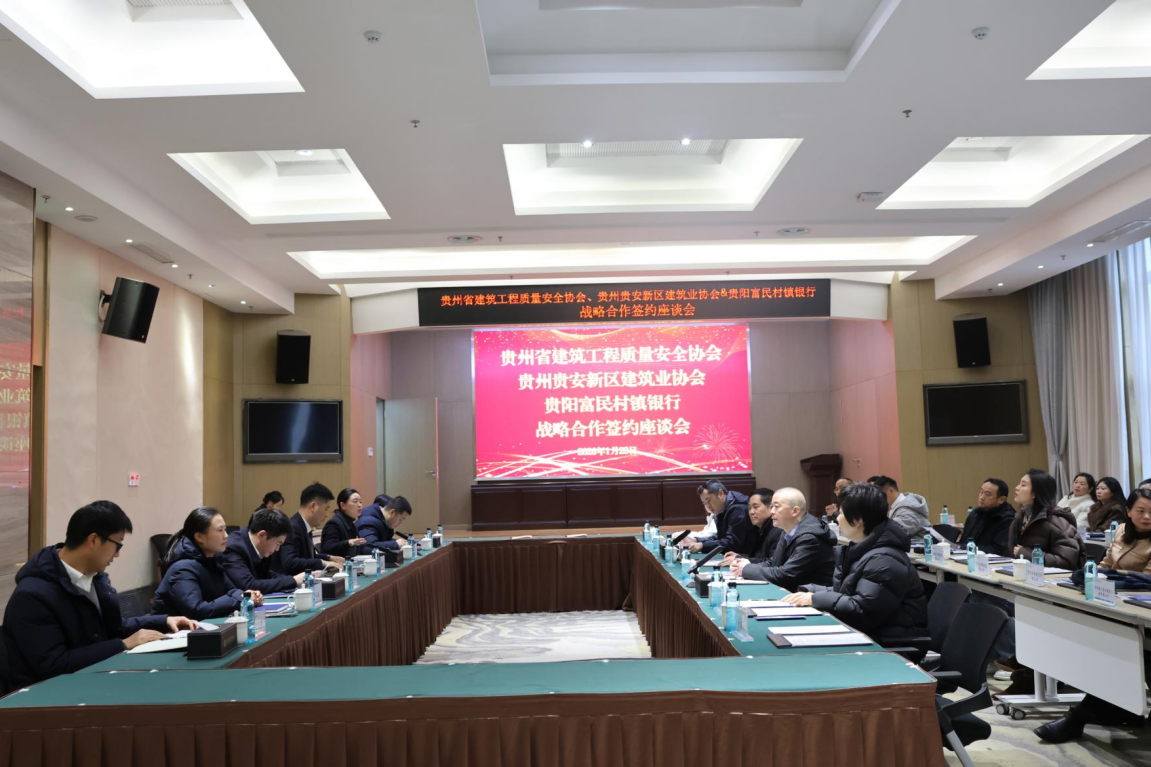 2026年1月23日,贵州省建筑工程质量安全协会(以下简称“协会”)与贵阳富民村镇银行(以下简称“银行”)战略合作签约仪式顺利举行。协会会长石福州、常务副会长兼秘书长刁兆勇、党支部书记王维娜,银行党支部书记执行董事/总行行长凌晓伟、总行行长助理蒋霞等相关领导及核心业务团队出席签约仪式,共同见证双方开启深度合作、协同发展的崭新篇章。