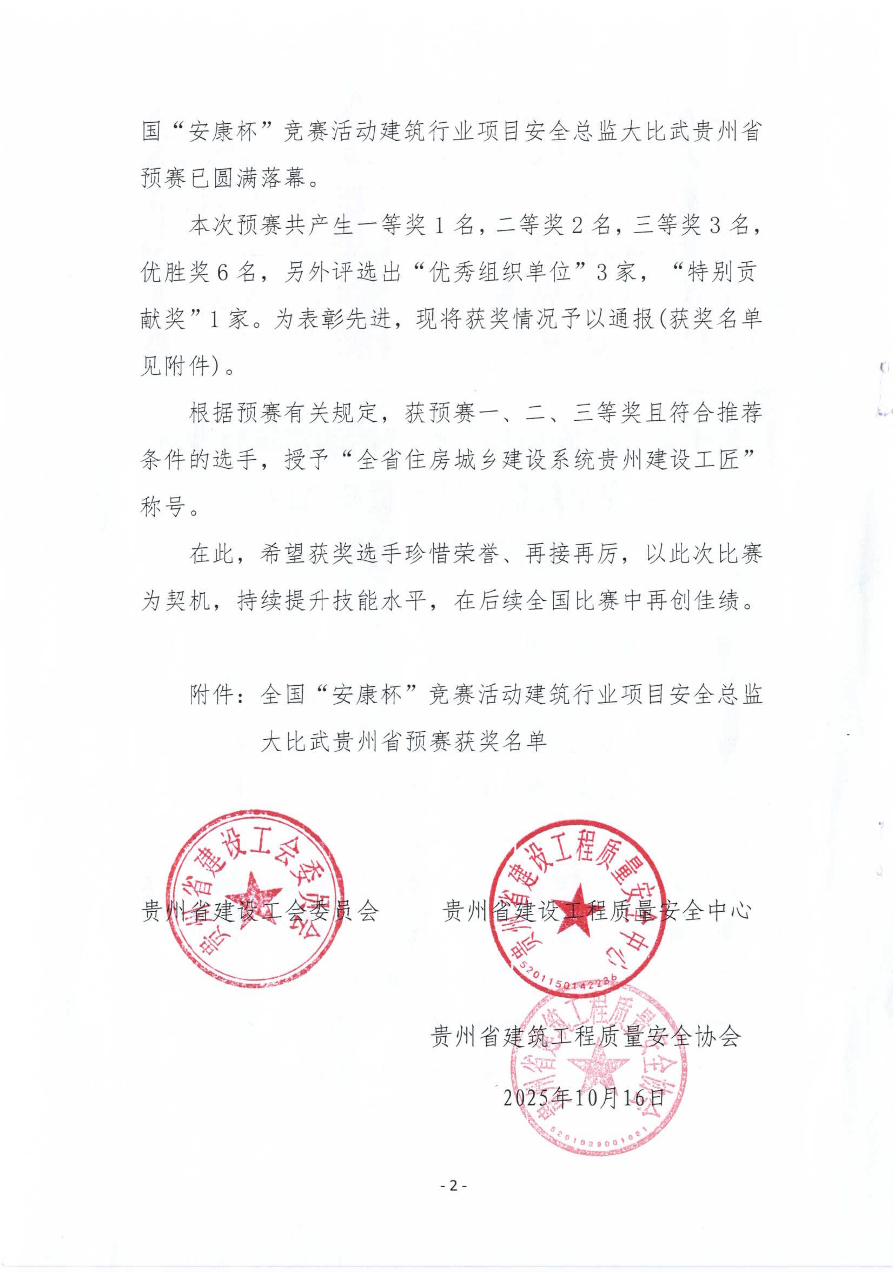 关于全国“安康杯”竞赛活动建筑行业项目安全总监大比武贵州省预赛获奖结果的通报